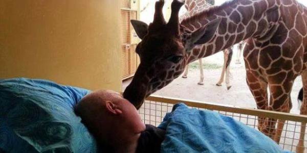 A foto de uma girafa a beijar um humano, deitado numa cama, está a emocionar as redes sociais. A história por detrás da foto justifica essa reação.