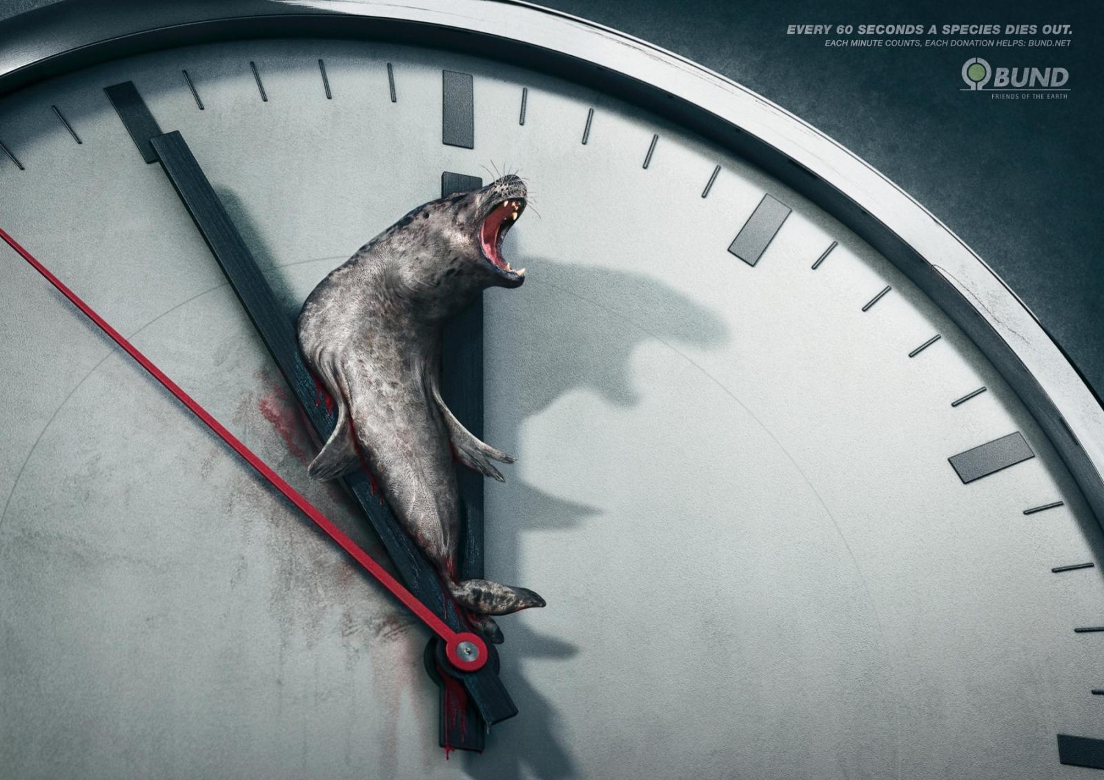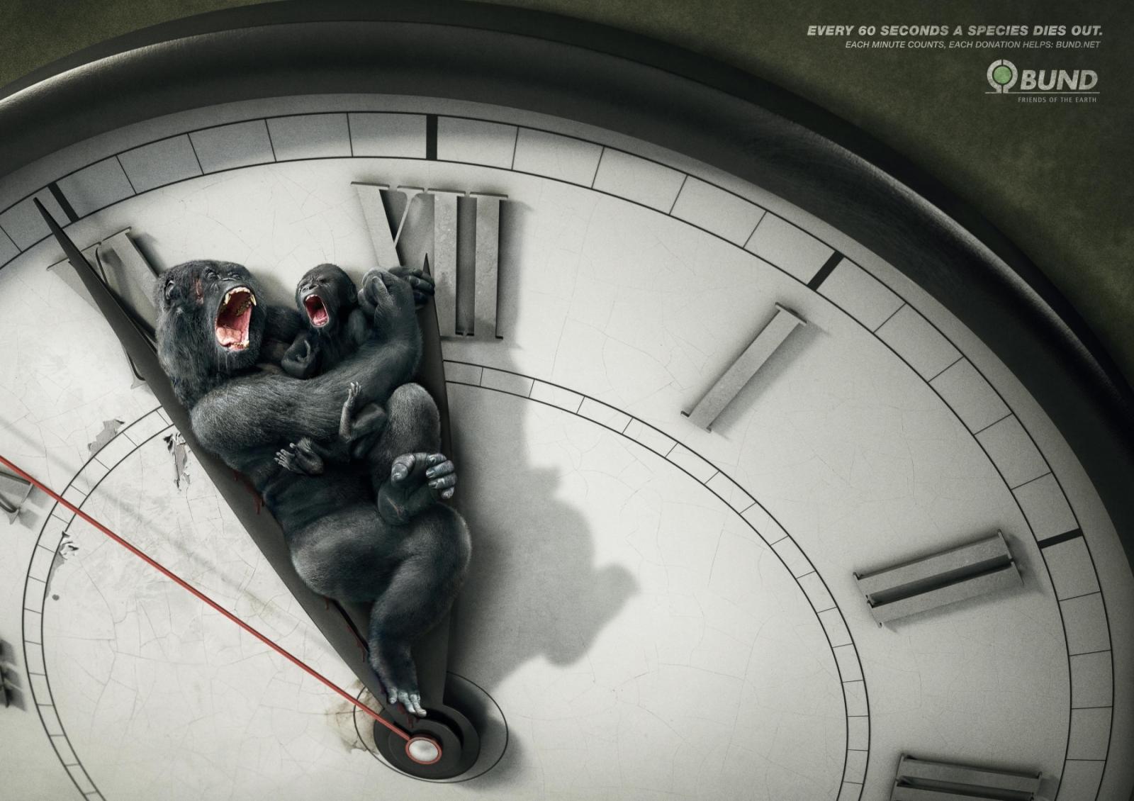 A agência de publicidade Scholz & Friends de Berlim conseguiu representar esta dificuldade através da colocação de algumas espécies ameaçadas a ser esmagadas por um relógio cujo tempo não pára.