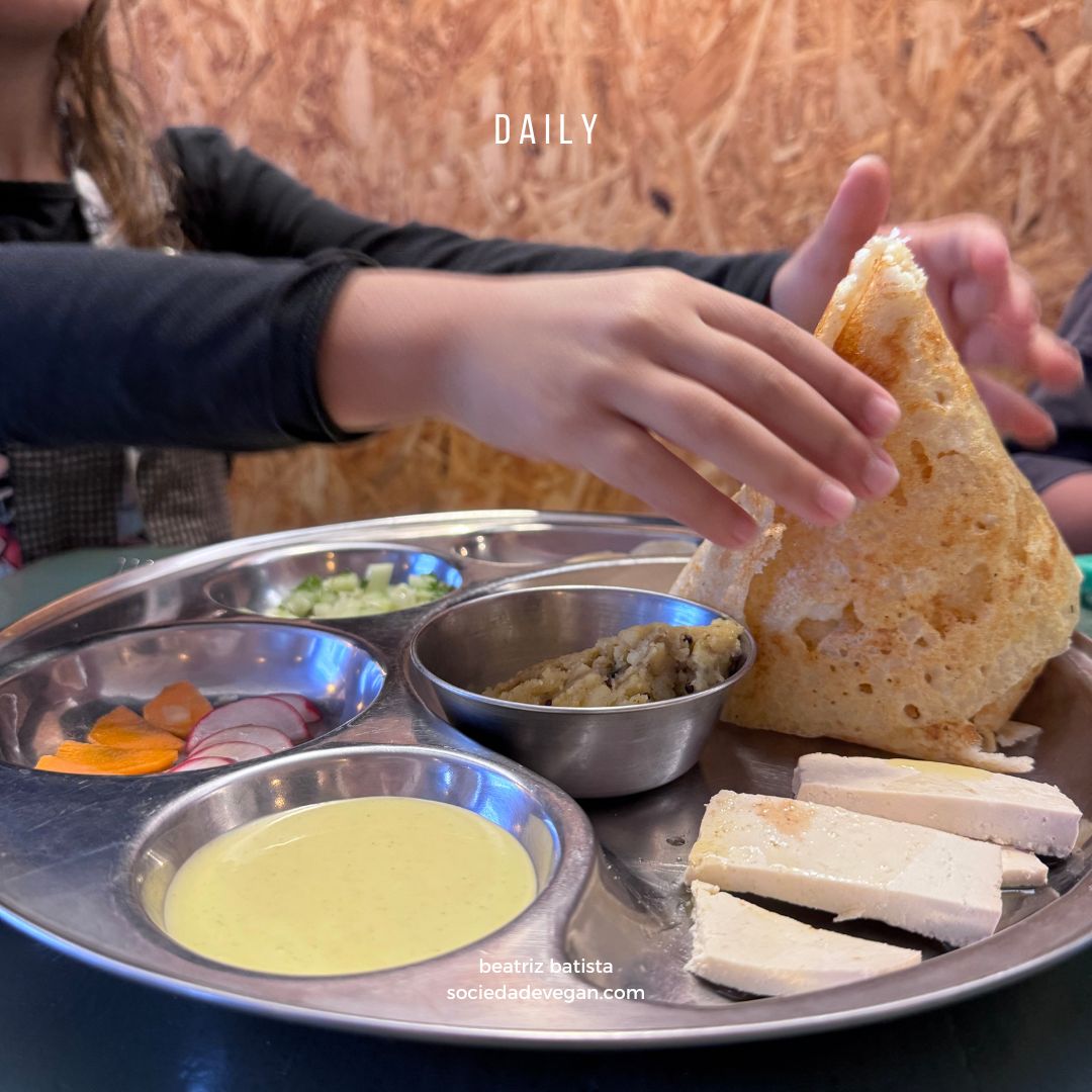 Nota relevante: Apesar de ser promovido como vegano, o restaurante inclui alguns produtos com ovos no seu menu, sendo essencial clarificar a nossa escolha. A bebida de gengibre fermentada, oferecida à nossa chegada, foi um sucesso entre a pequenada! As dosas, contudo, ficaram aquém do esperado – falta de crocância e sabor pouco definido.