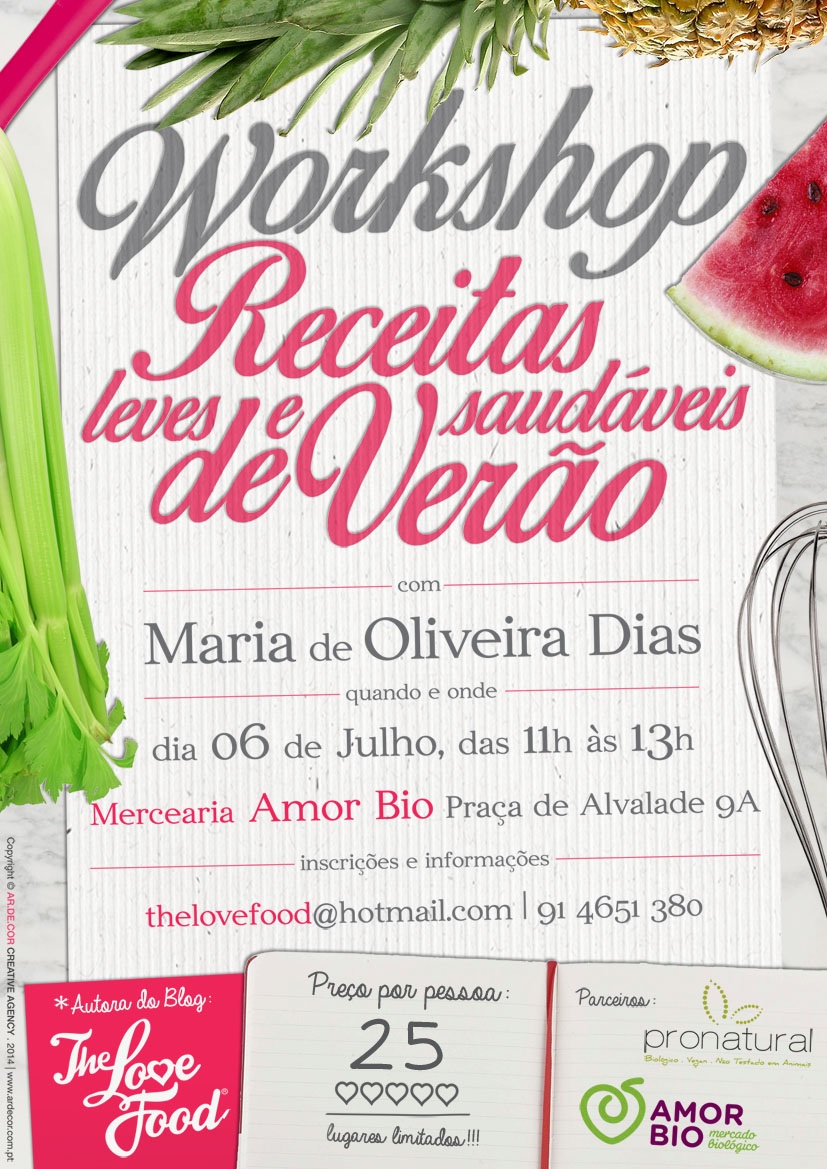 O THE LOVE FOOD, em parceria com a PRONATURAL, marca de produtos naturais e super alimentos, apresenta o workshop “Receitas Leves e Saudáveis de Verão” na Mercearia Amor Bio, sita na Praça de Alvalade 9, em Lisboa.